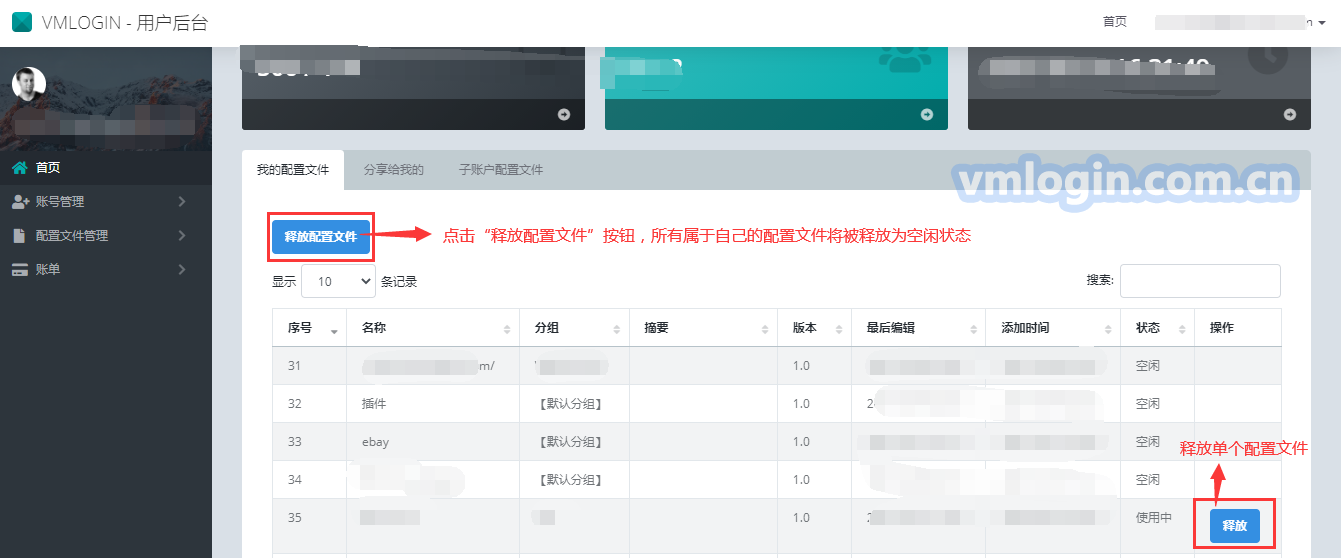 b. 可以登陆Web用户后台,有释放配置文件的按钮。配置文件列表里有单项释放,和释放所有的可供用户自己选择。