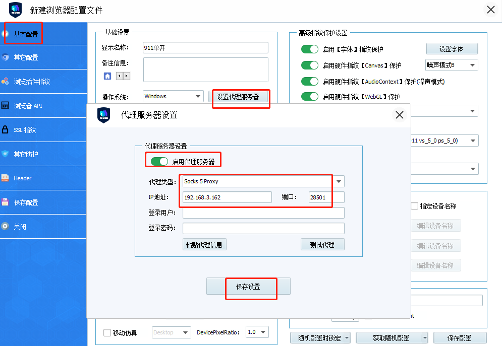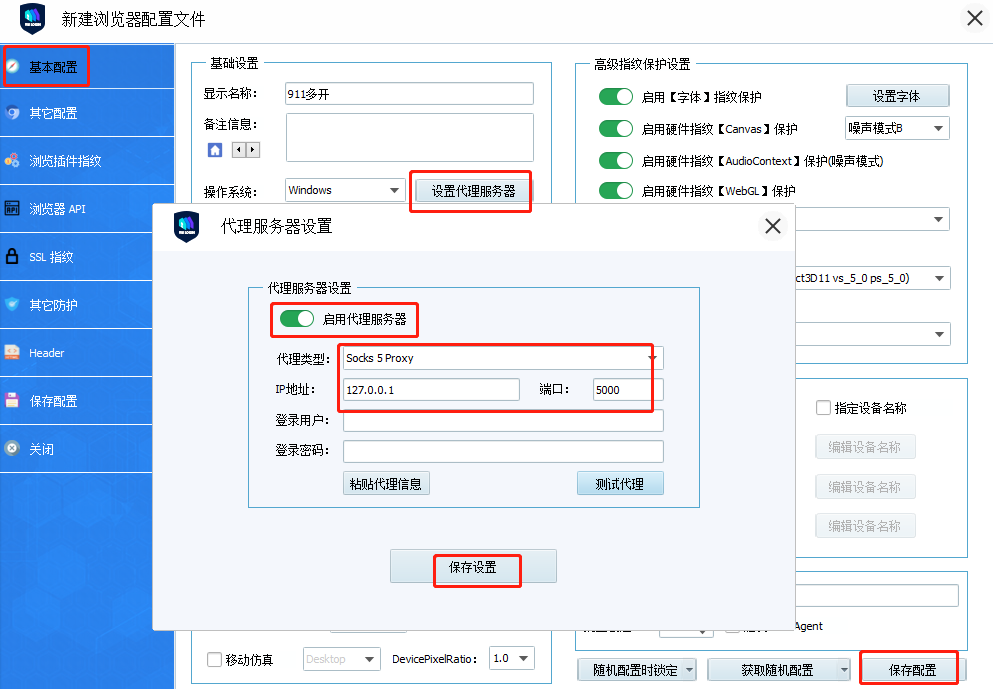 5、启动VMlogin,新建浏览器配置文件 ->点击“设置代理服务器”->启用代理服务器->代理类型选择“Socks5” ->911里查看Local Proxy的IP和端口(蓝色),输入IP和端口,用户名和密码留空即可,如下图: