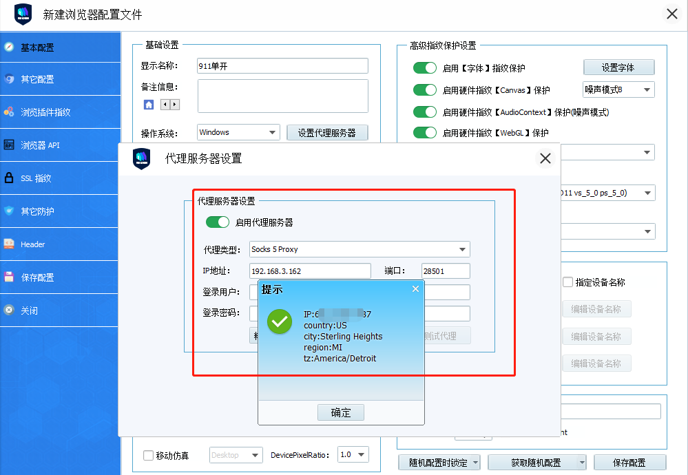 6、点击测试代理,测试成功后会提示IP相关信息。然后保存设置,配置文件就可以启动浏览器测试socks5代理了。