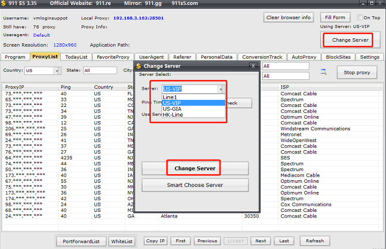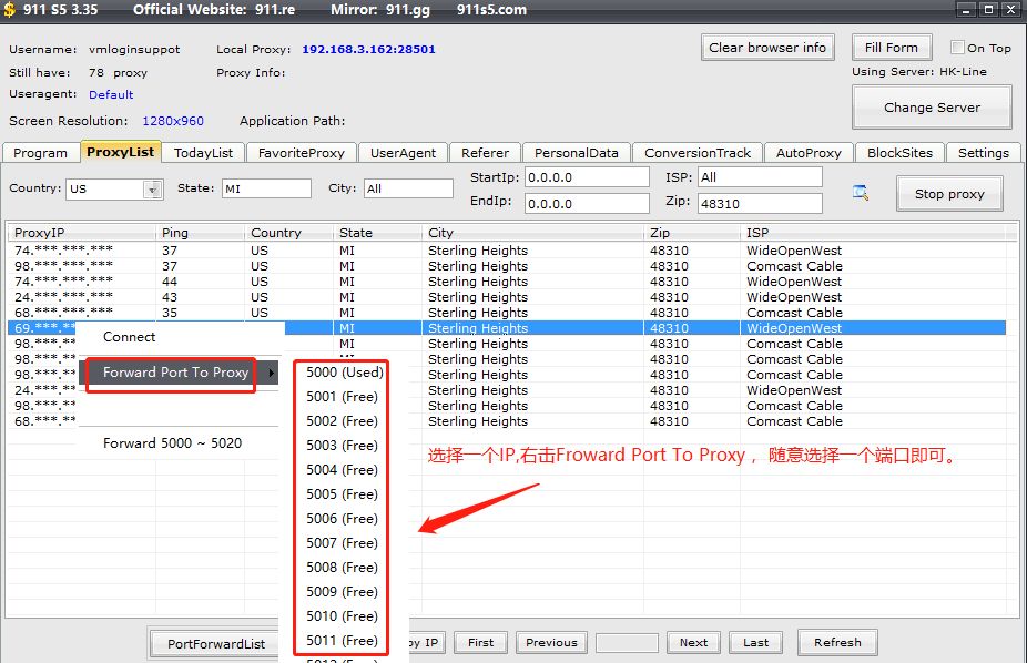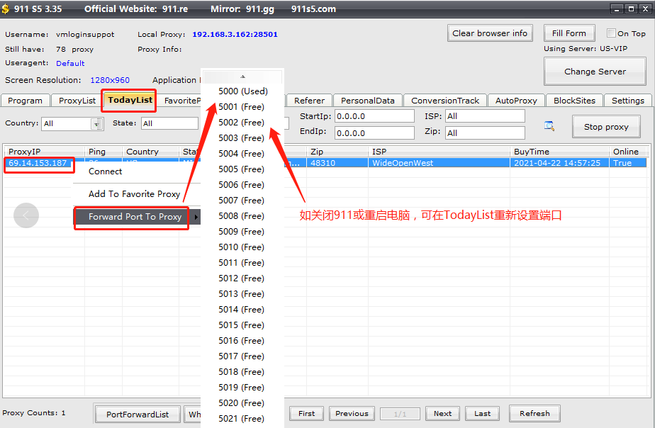 答:可以在TodayList里选择未连接的IP,右击选择“Forward Port To Proxy”重新设置端口。注:“Proxy info”的红色IP为已连接IP, 不可以设置新端口,除非重启911。