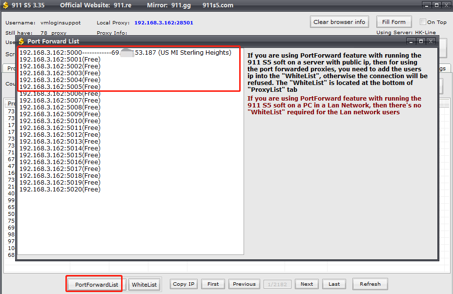 切记:在不需要使用很多IP 的情况下,请误选择“Forward 5000~5020”,选择此按钮则代表会同时为这些端口分配21个IP(IP有时效性哦)。